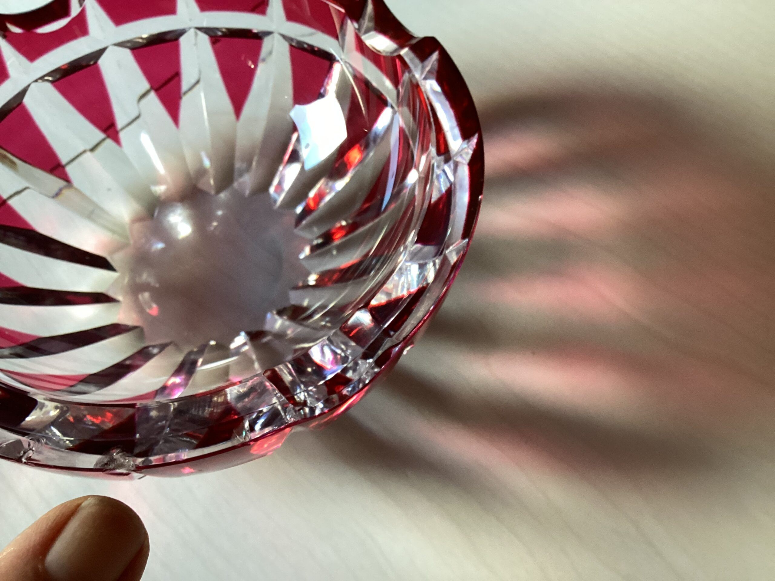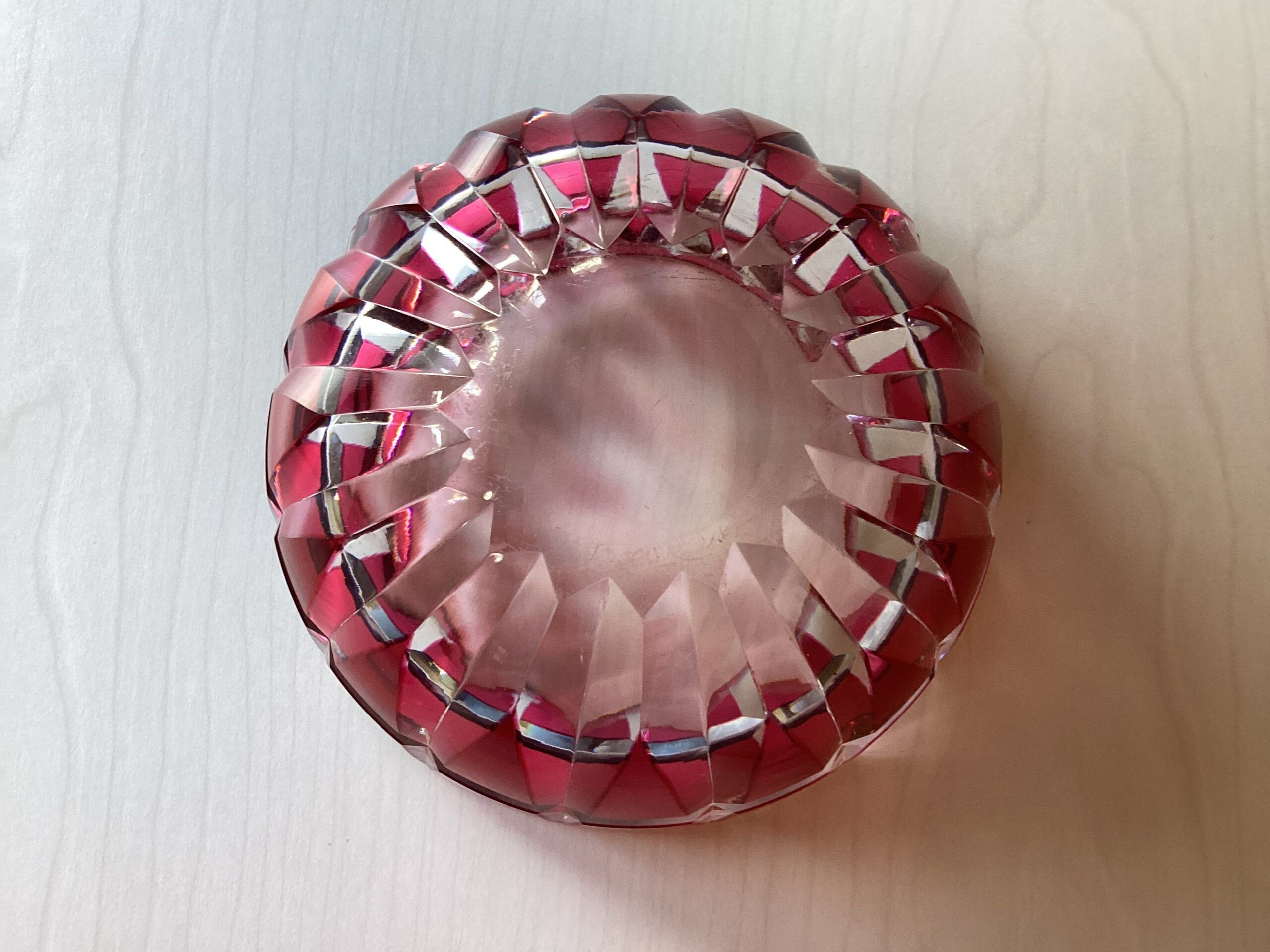 Cendrier rouge bordeaux et transparent, en cristal Val Saint Lambert, diamètre 13,5 cm, hauteur 5 cm, poids 870 gr. ( 3 mini coups)