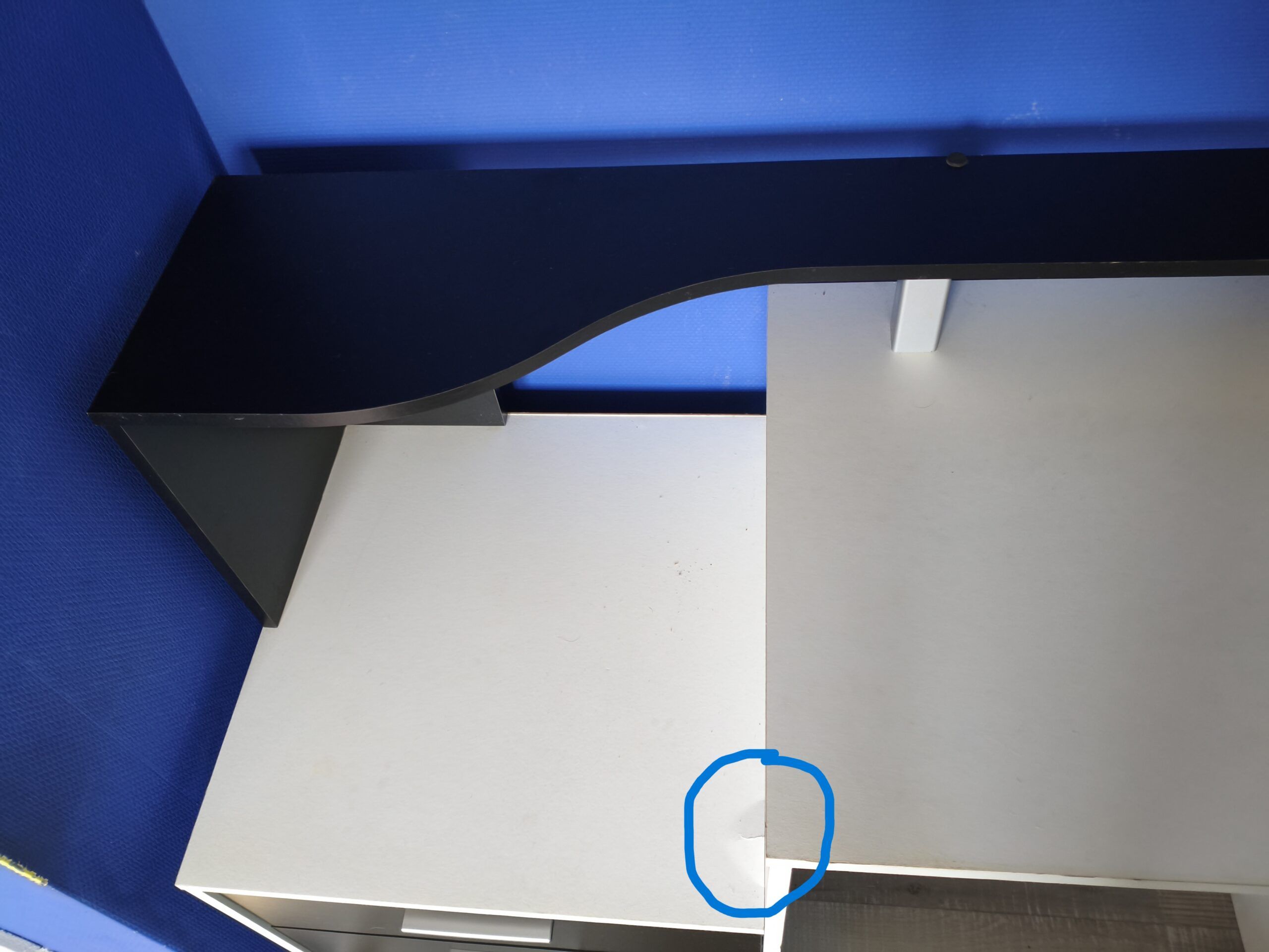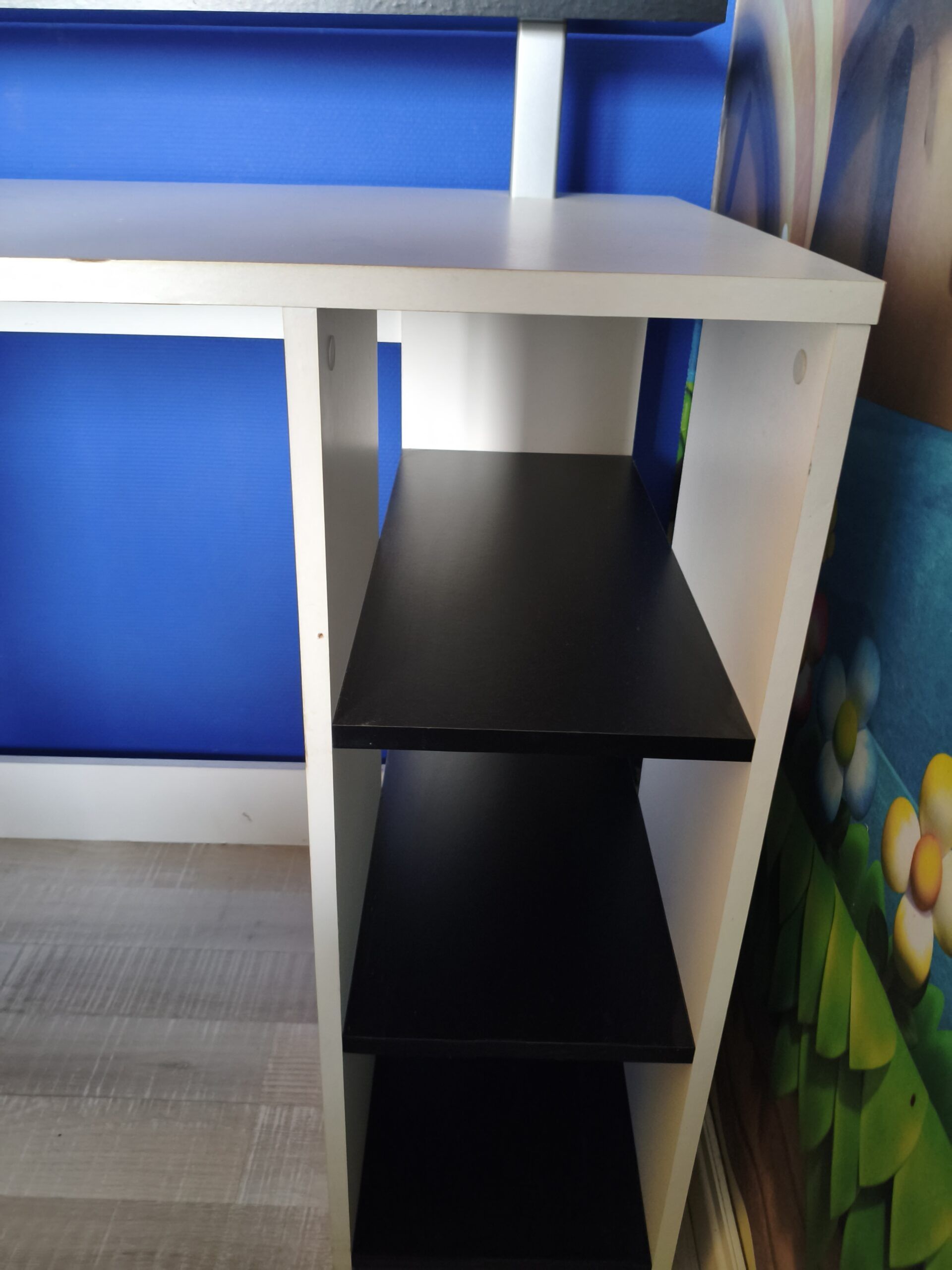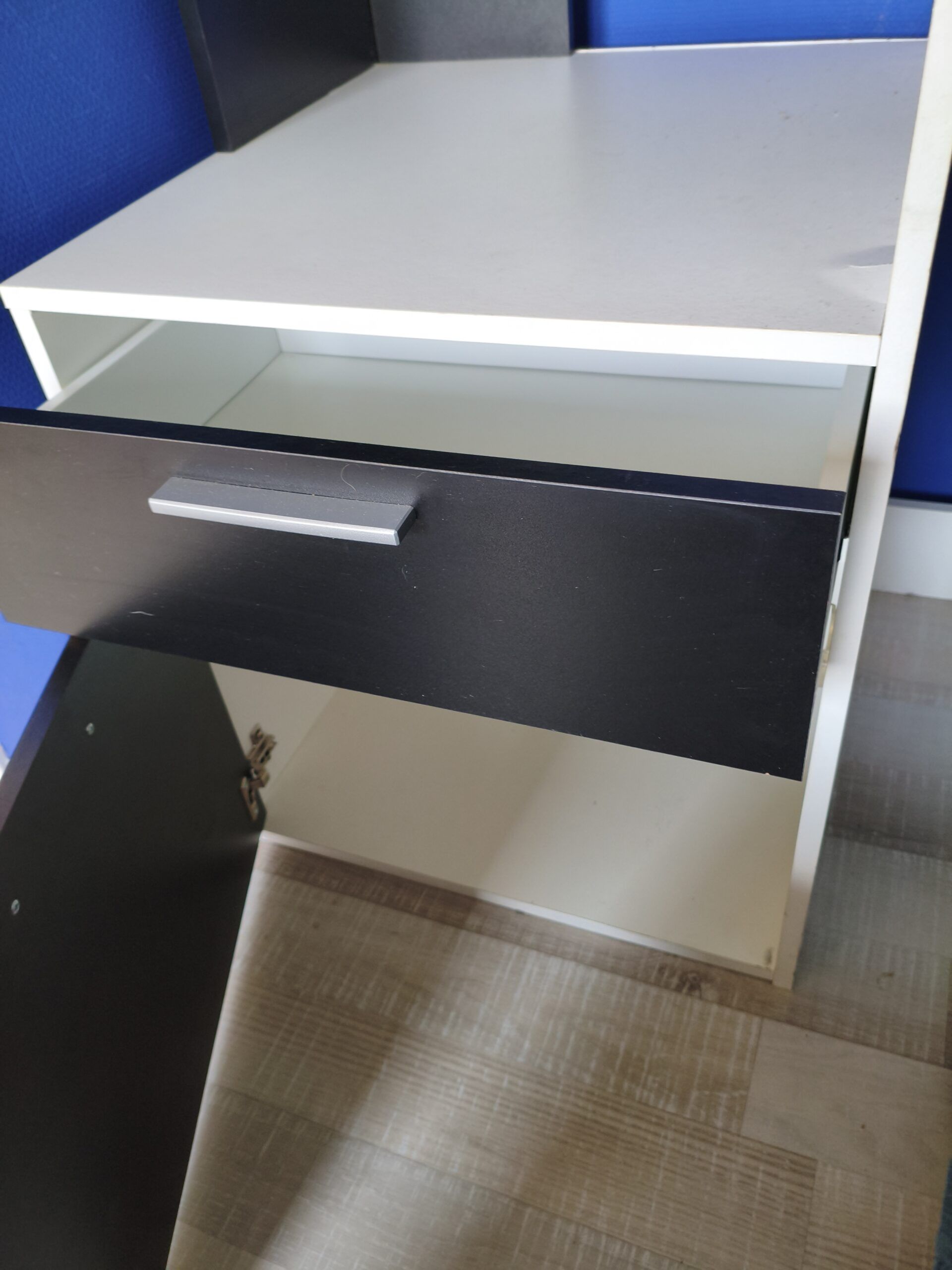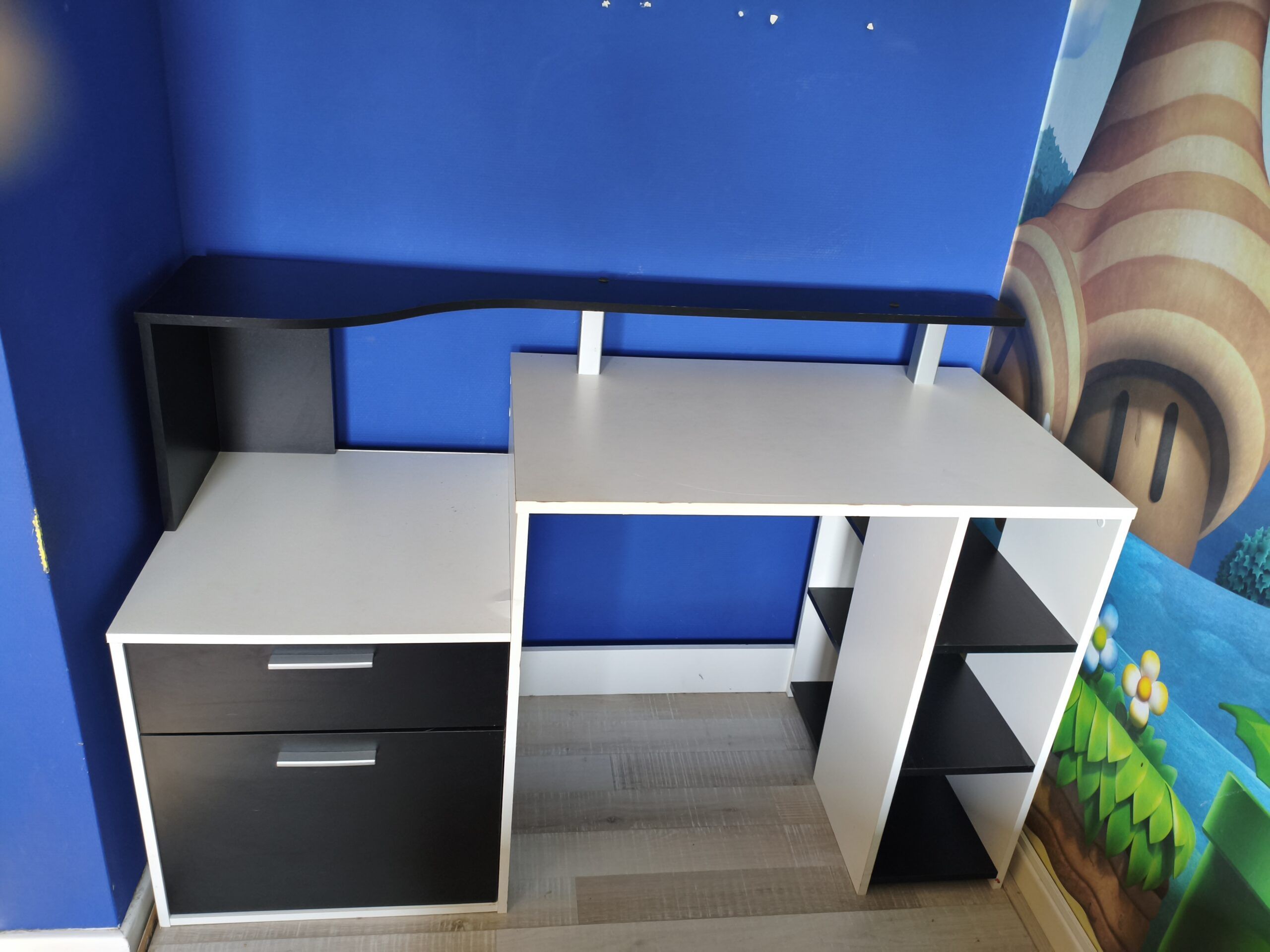 - 1 bureau noir et blanc comprenant 1 armoire, 1 tiroir, 3 étagères et un sur-bureau intégré. 2 petits défauts qui se voient à peine : 1 petite fissure sur le plat au dessus de l'armoire, usure de la tranche due aux frottements (se remplace facilement). Longueur : 140cm-largeur : 55 cm-hauteur : 90 cm