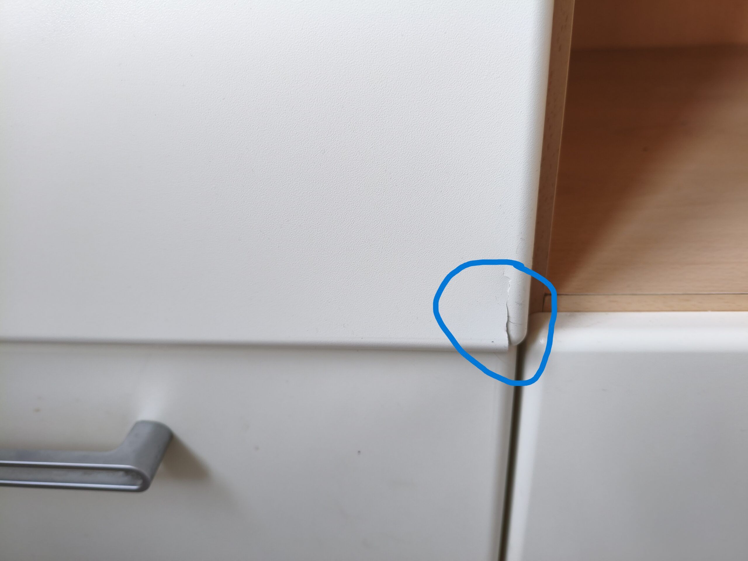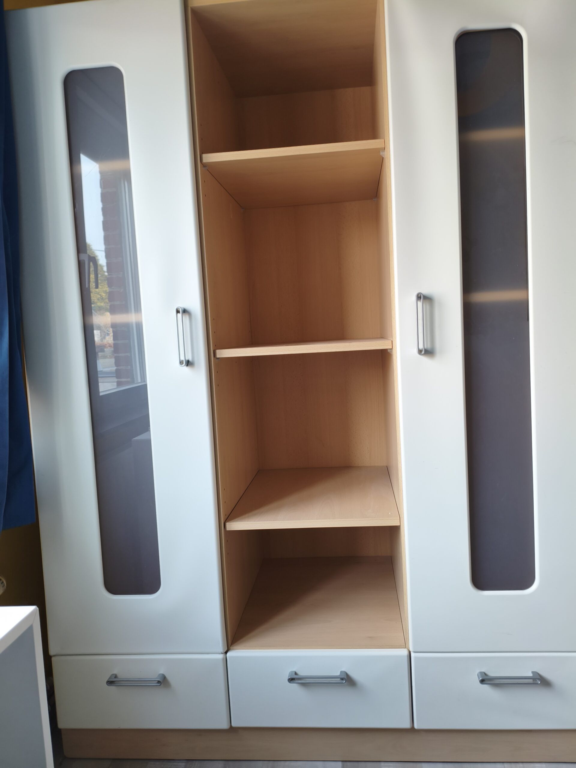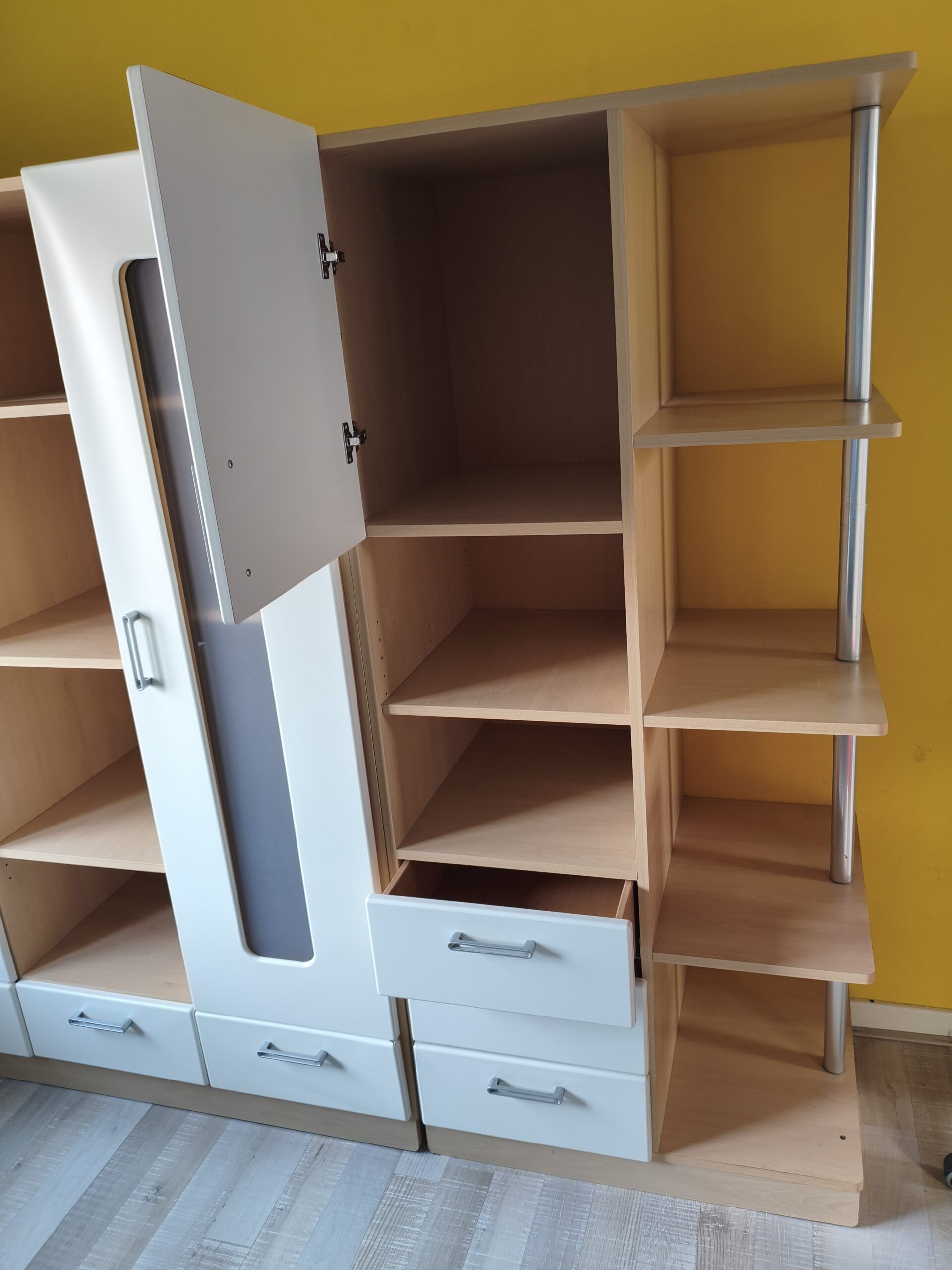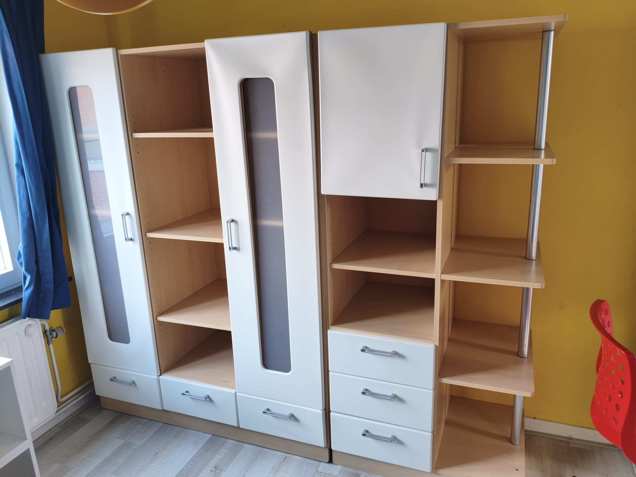 - 1 garde robe blanche et bois. peut se mettre en 2 parties. 5 colonnes de rangement : 2 portes, 2 penderies basses, 6 tiroirs, 5 espaces fermés, 8 espaces ouverts. Portes bois recouvert et plexiglas. Petit défaut qui se voit à peine au bas d'une porte : la couche de protection a tendance à se décoller (se rectifie facilement). Longueur totale : 2,14m- hauteur : 1,80m-profondeur : 55cm