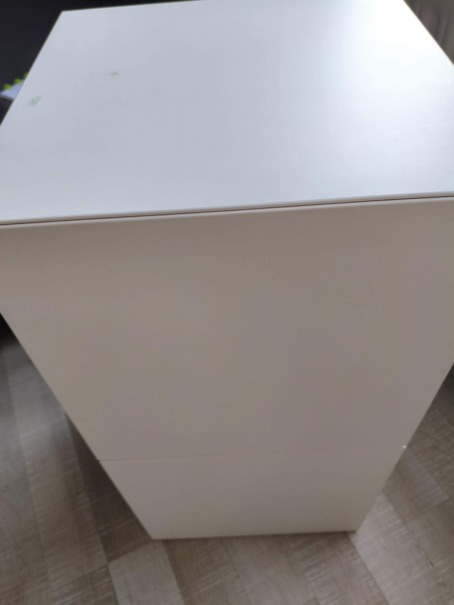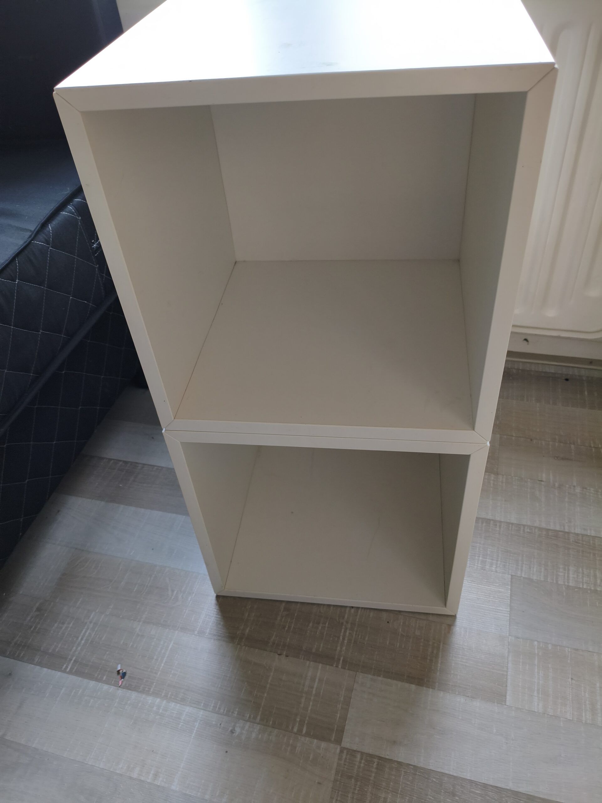 - 1 table de nuit ouverte 2 box, bois blanc. Défauts : 2 petites taches incrustées sur le dessus, présence d'autocollants sur le côté qui se retirent aisément avec une lame. Largeur : 35 cm-profondeur : 35 cm-hauteur : 70 cm