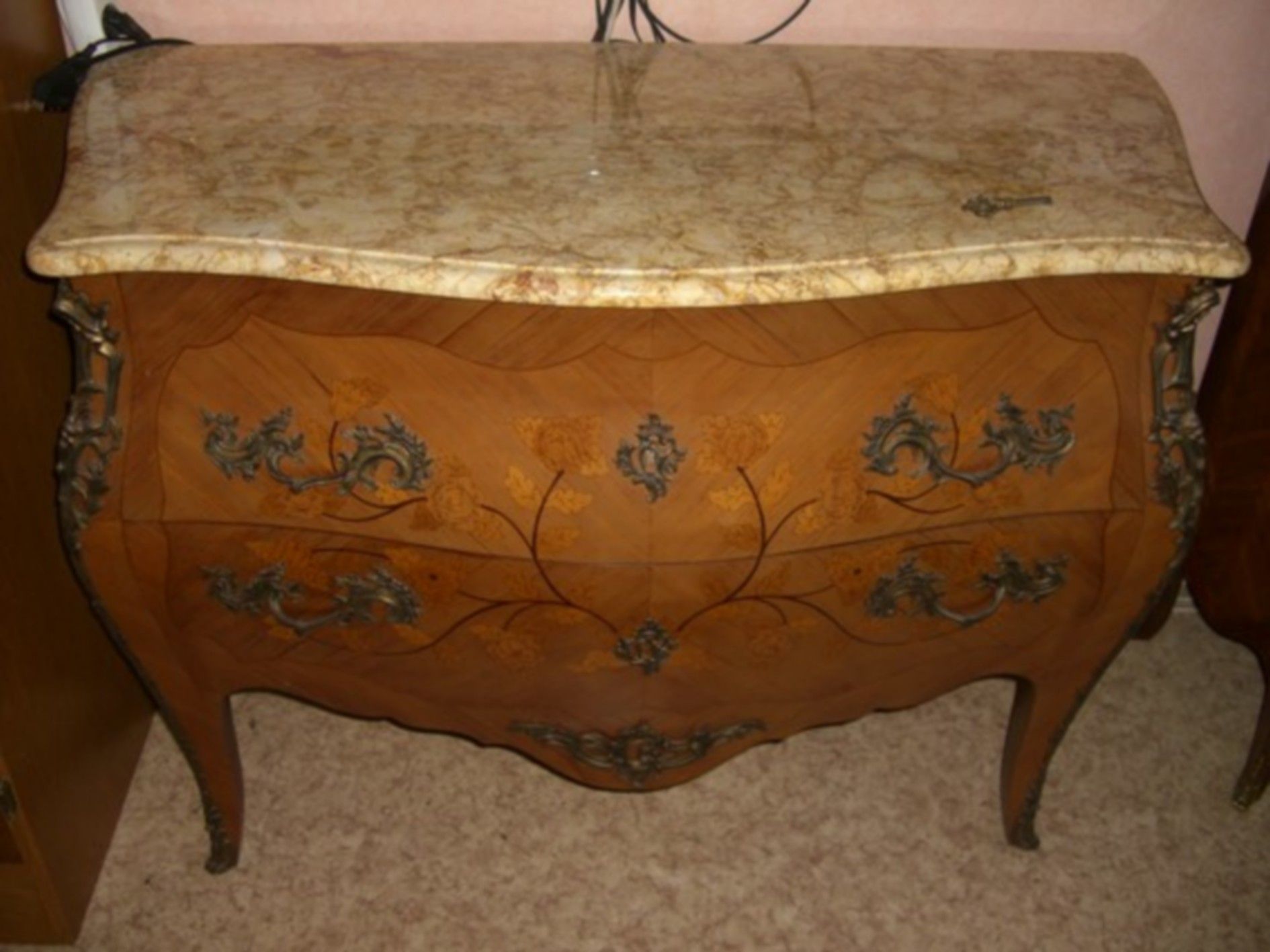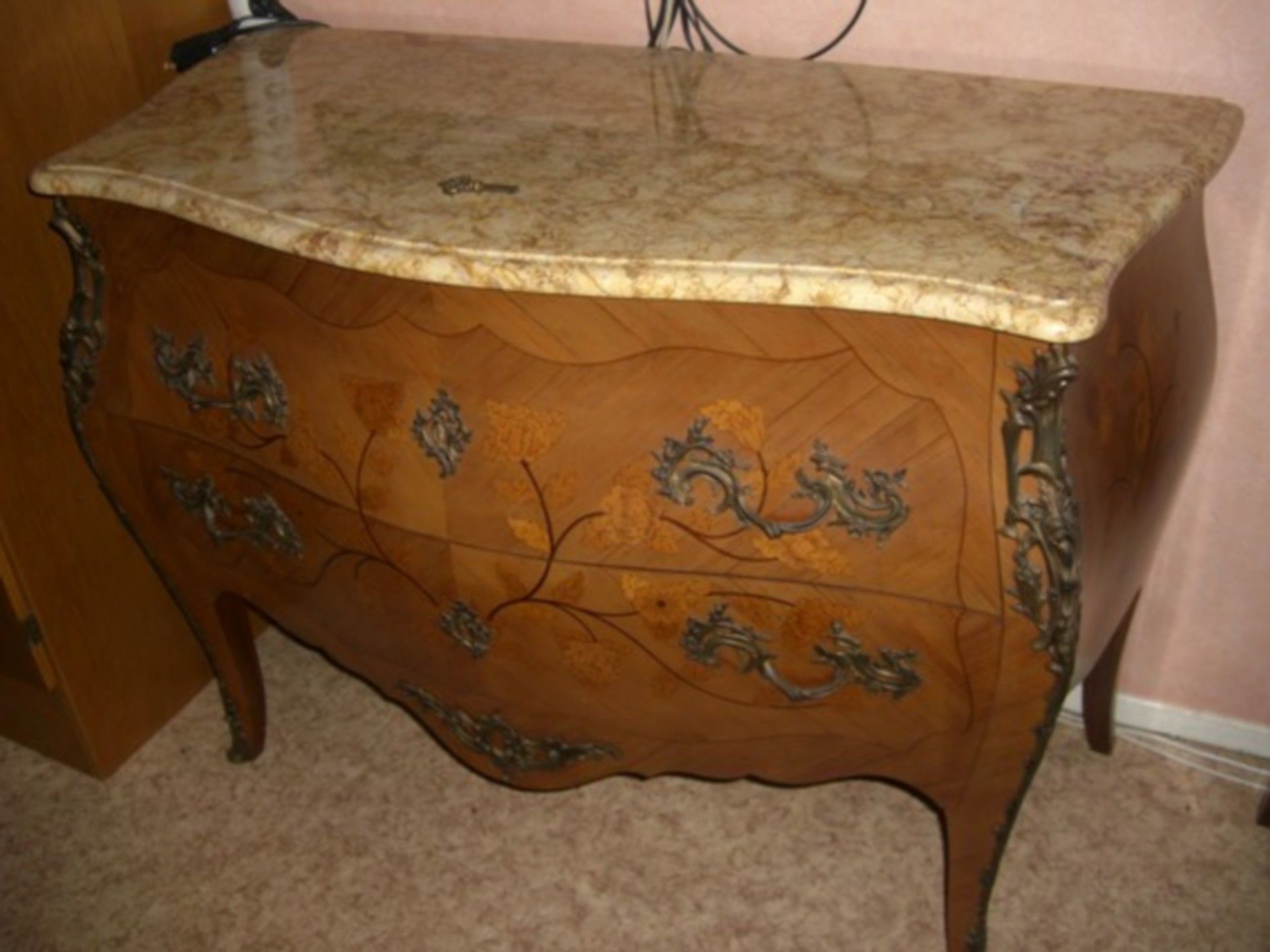 Une commode galbée marqueterie bois de rose style louis XV avec clé.