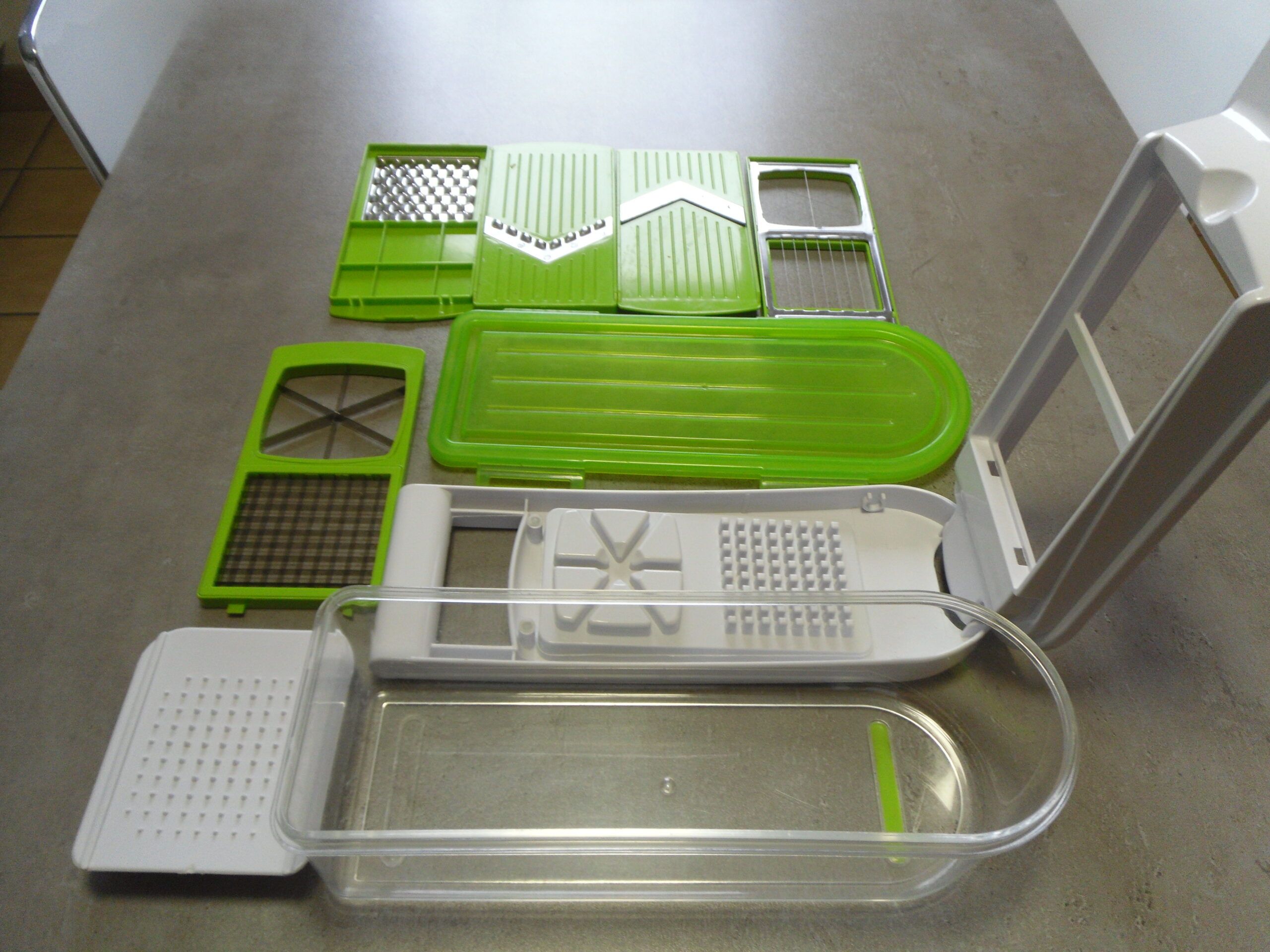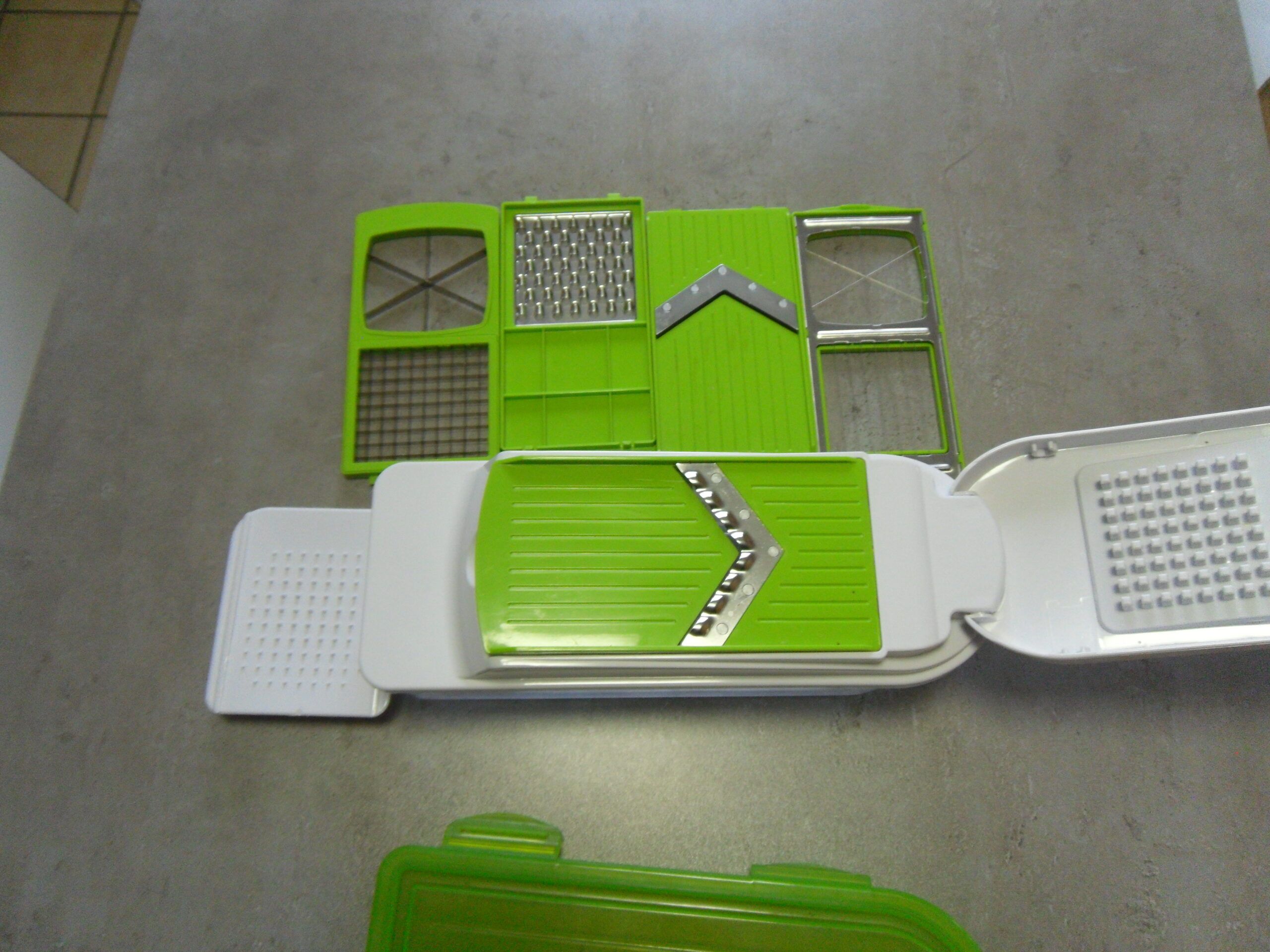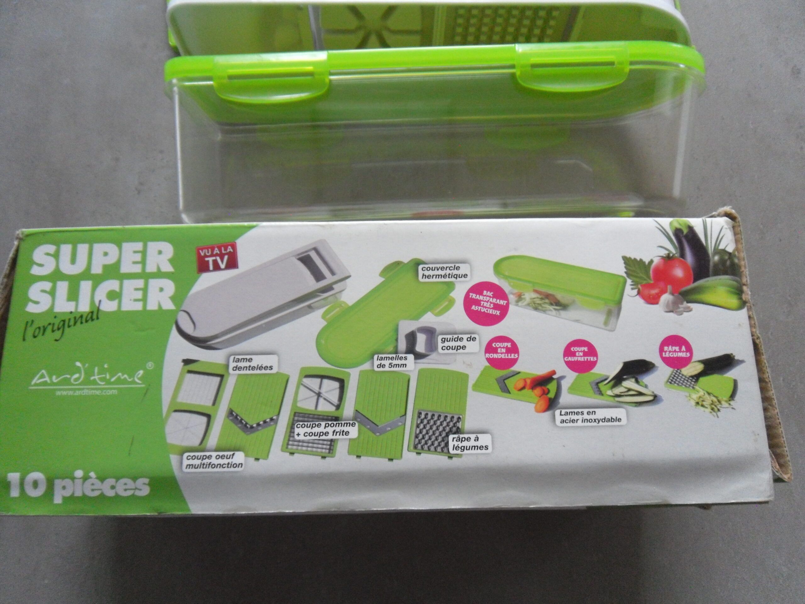 ARD'TIME Super Slicer Blanc et Vert 10 pièces                                                                                                                              Le produit magique de votre cuisine                                                                                                                                                    Le Super Slicer râpe, hache, émince et découpe.