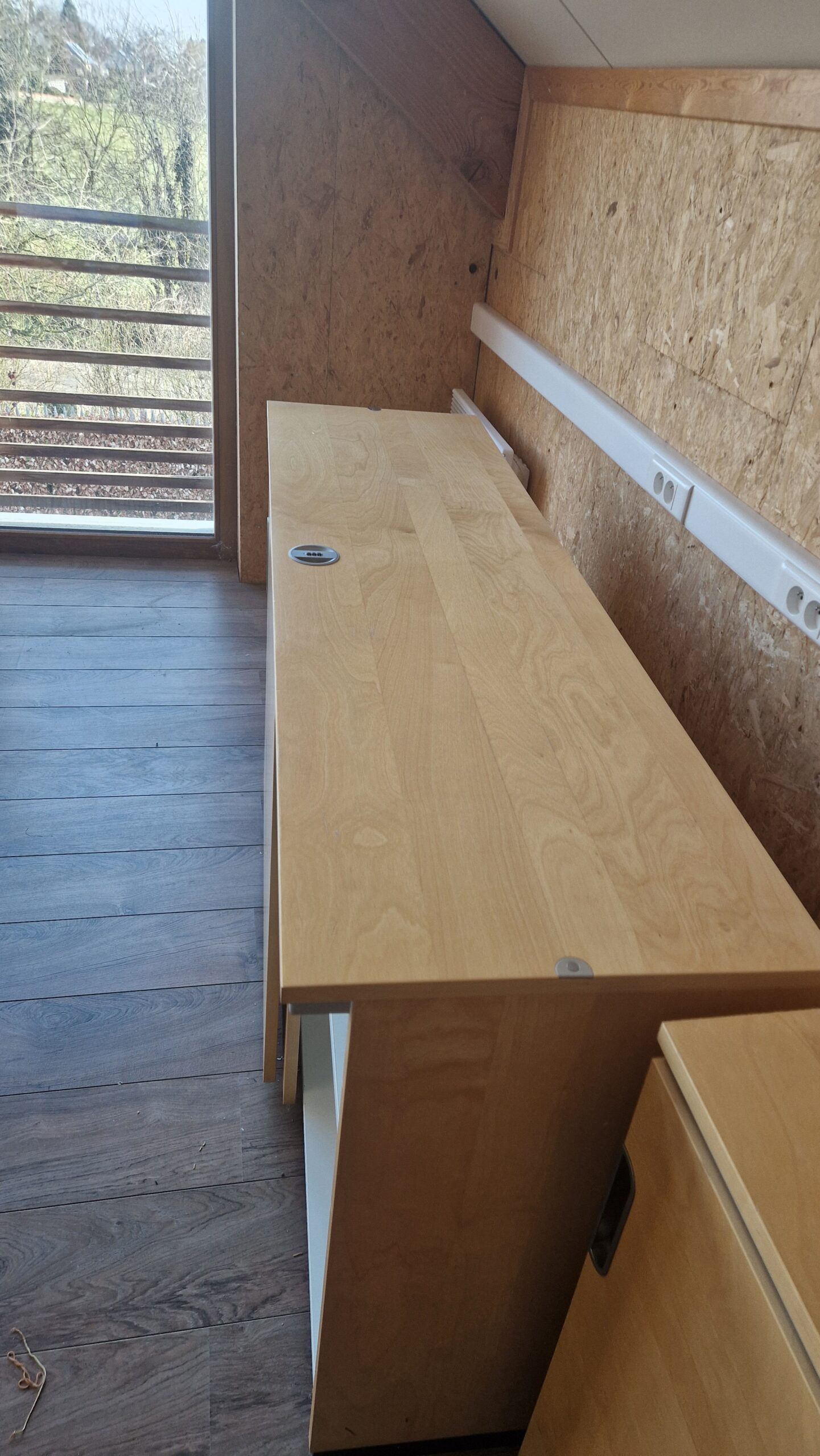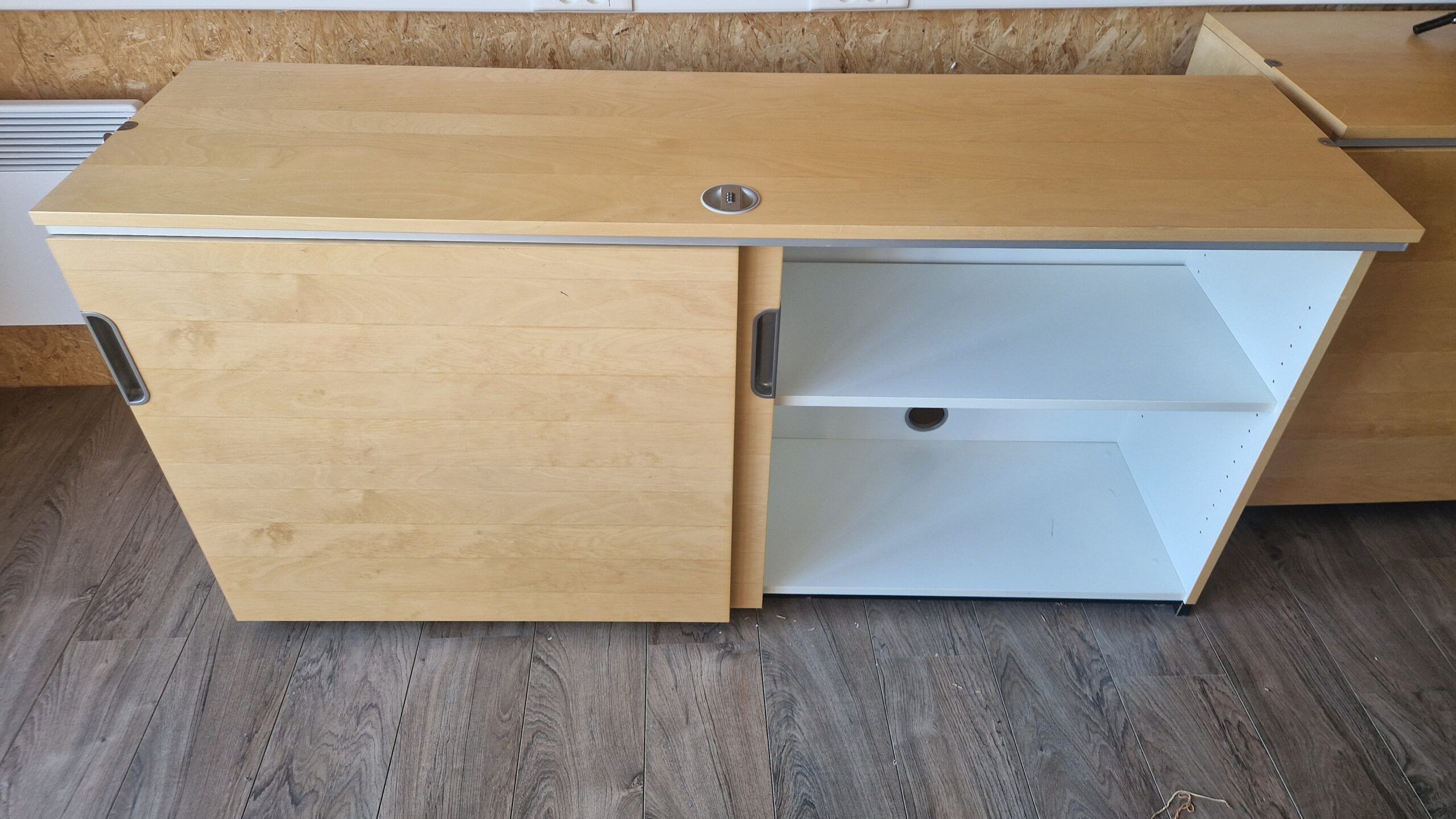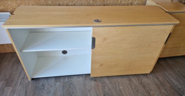 Meuble de rangement en bois à porte coulissantes. Utile pour ranger des documents dans un bureau.