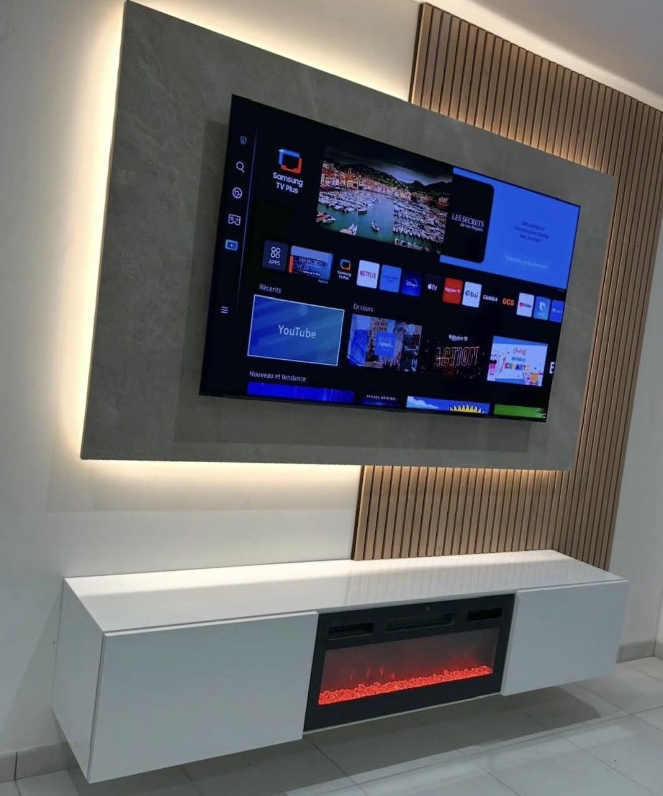 Bien plus qu'un simple support, nos créations sur mesure transforment votre mur TV en une véritable pièce maitresse. Entre noblesse du marbre (PVC haute finition) et jeux de lumières subtils, nous concevons des espaces qui allient design contemporain et finitions artisanales d'exception.