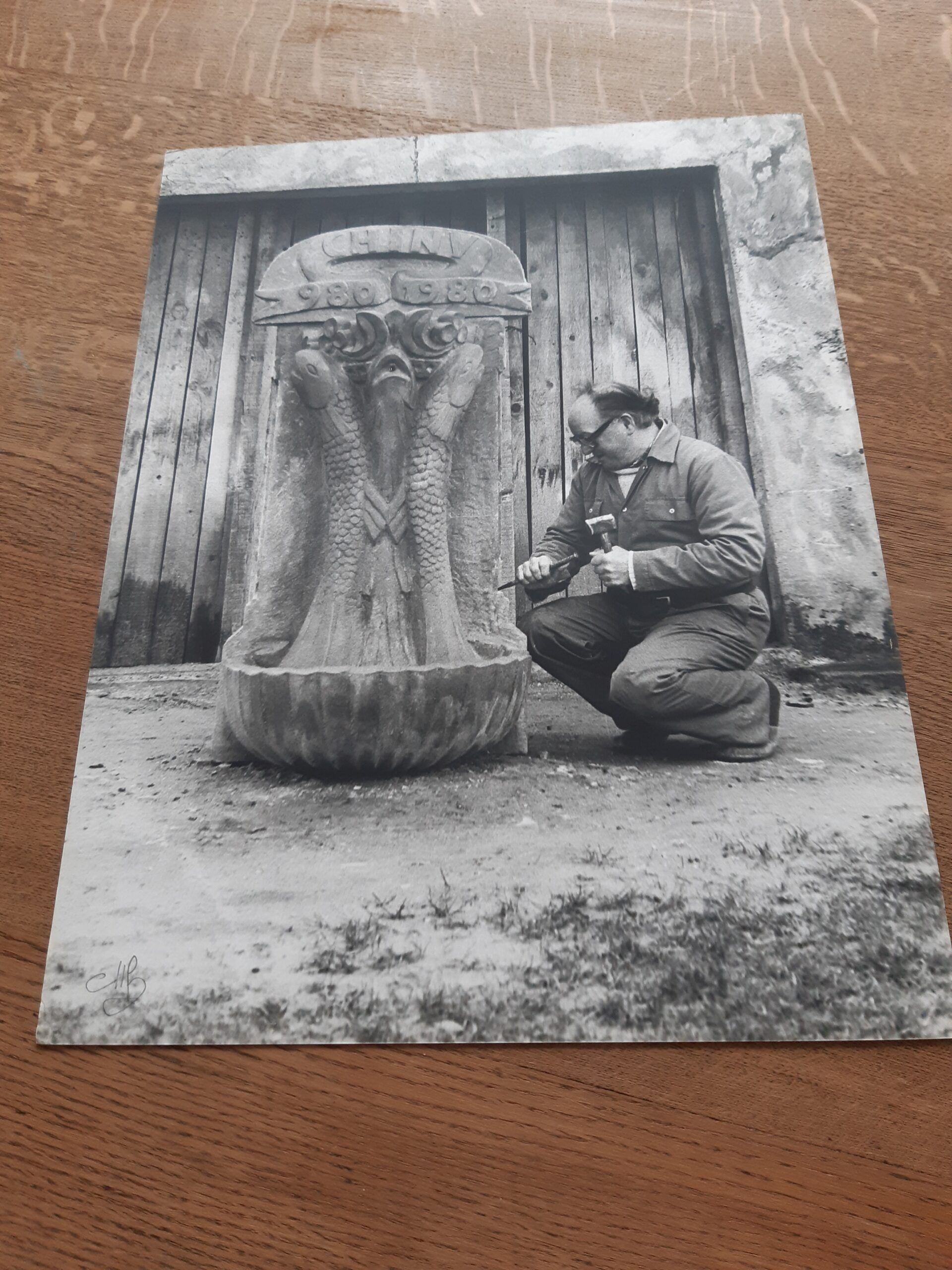 Photo Emile Delhaye sculptant une fontaine ornée des 3 truites de Chiny