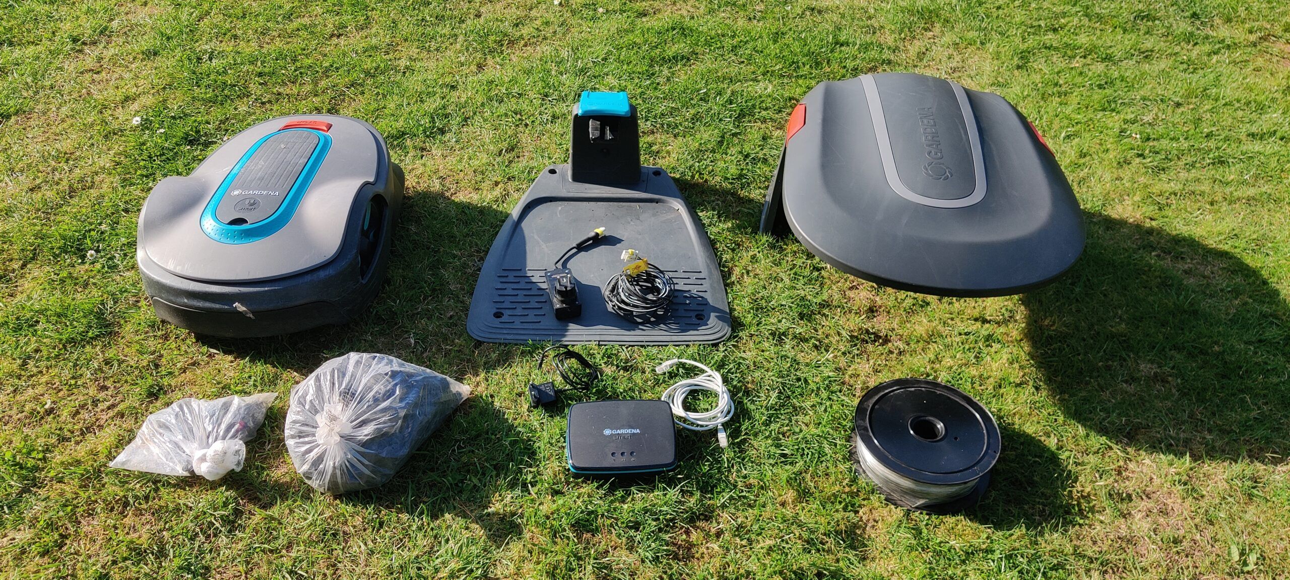 Tondeuse robot avec accessoires complets (dont 250 mètres de nouveau câble périphérique neuf) + garage. Fonctionne parfaitement !