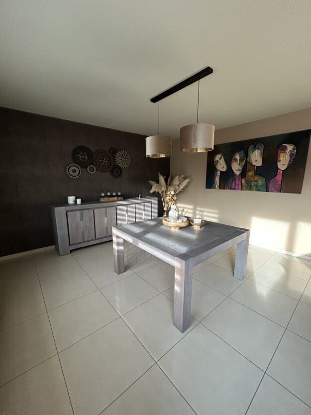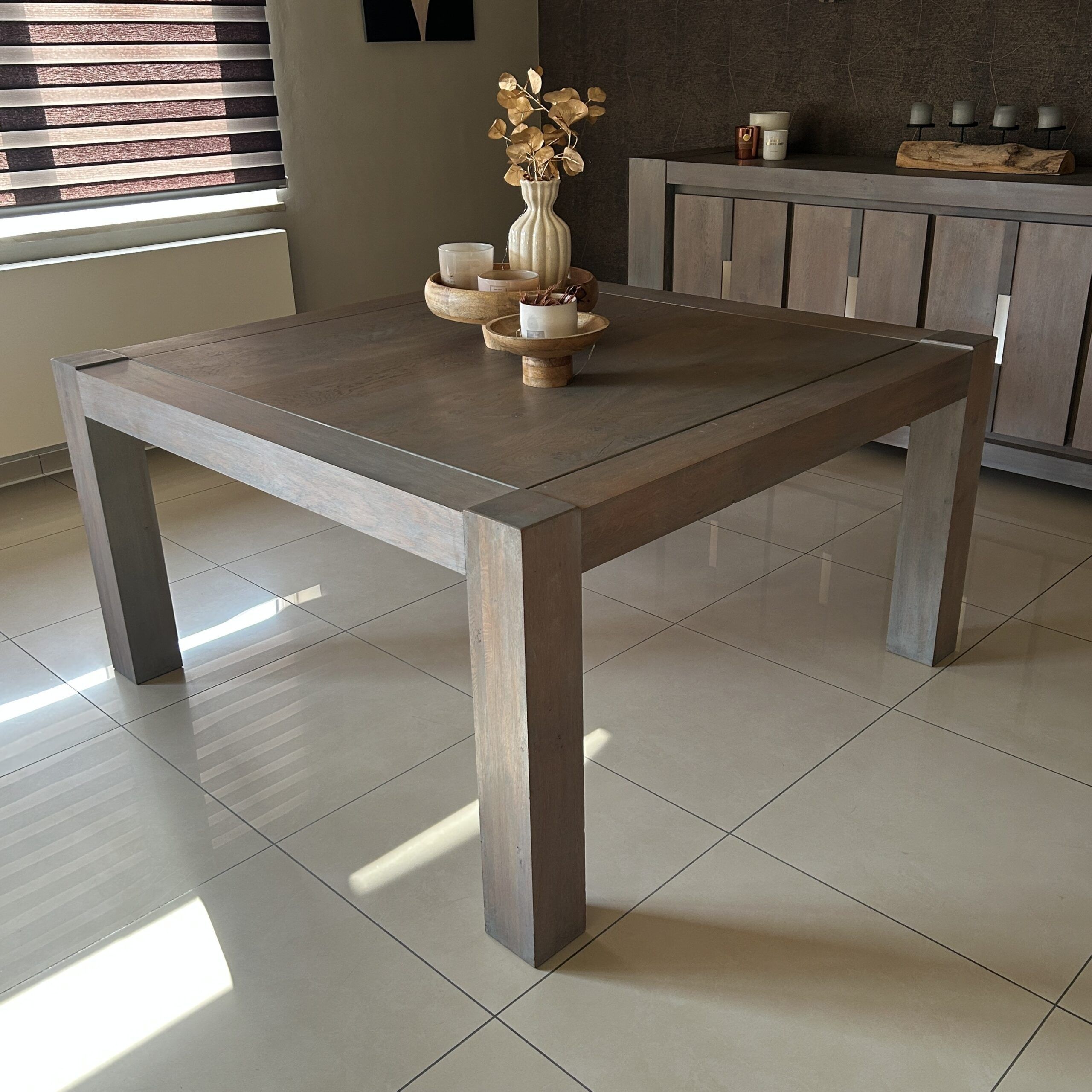 Je mets en vente une salle à manger en bois massif de grande qualité, composée d’une table carrée imposante et d’un dressoir assorti.