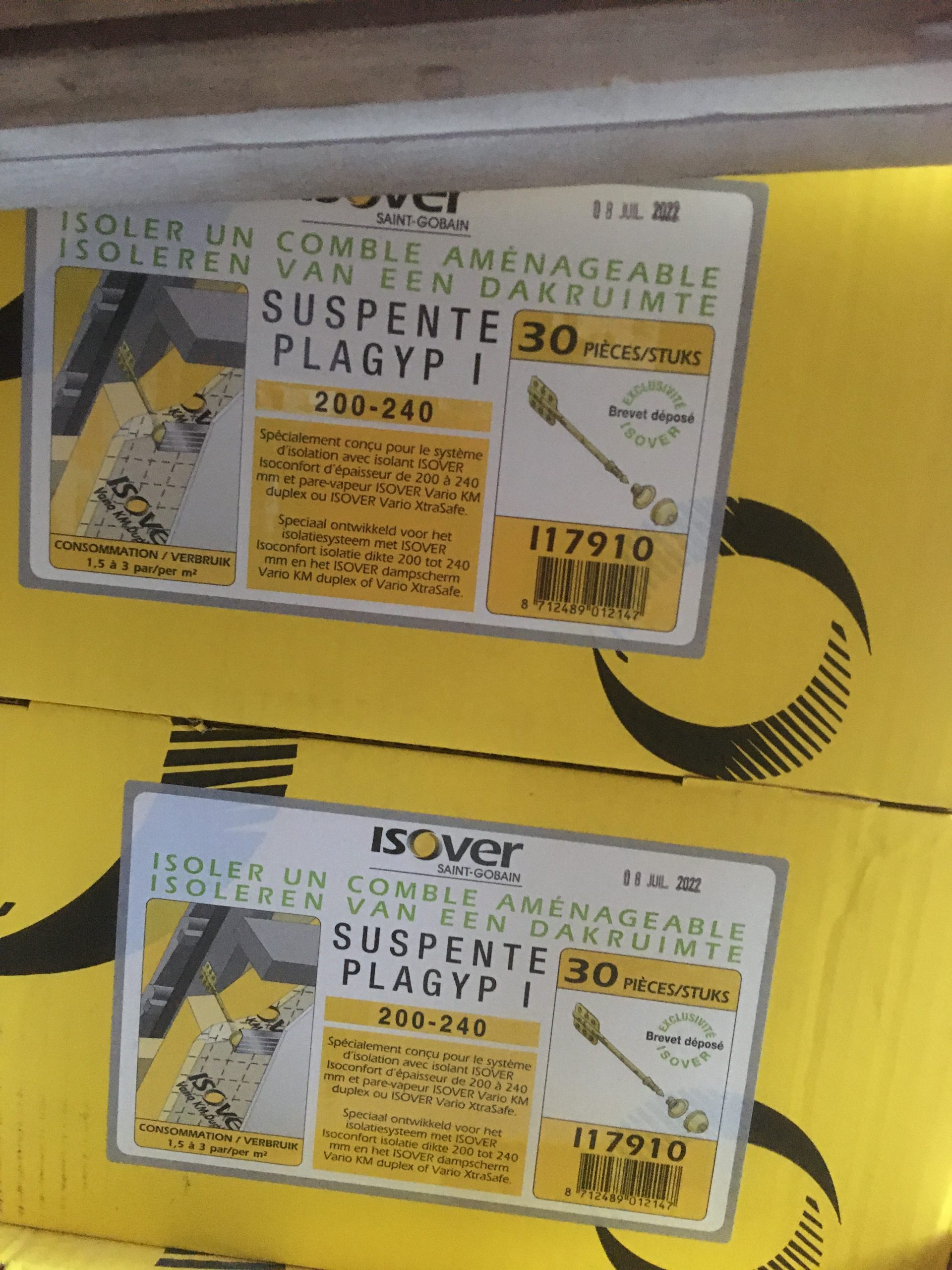8 boîtes de supentes PLAGYP I 200-240 ISOVER pour la réalisation de plafond isolé sous combles. 30 suspentes par boîte. Jamais servi.