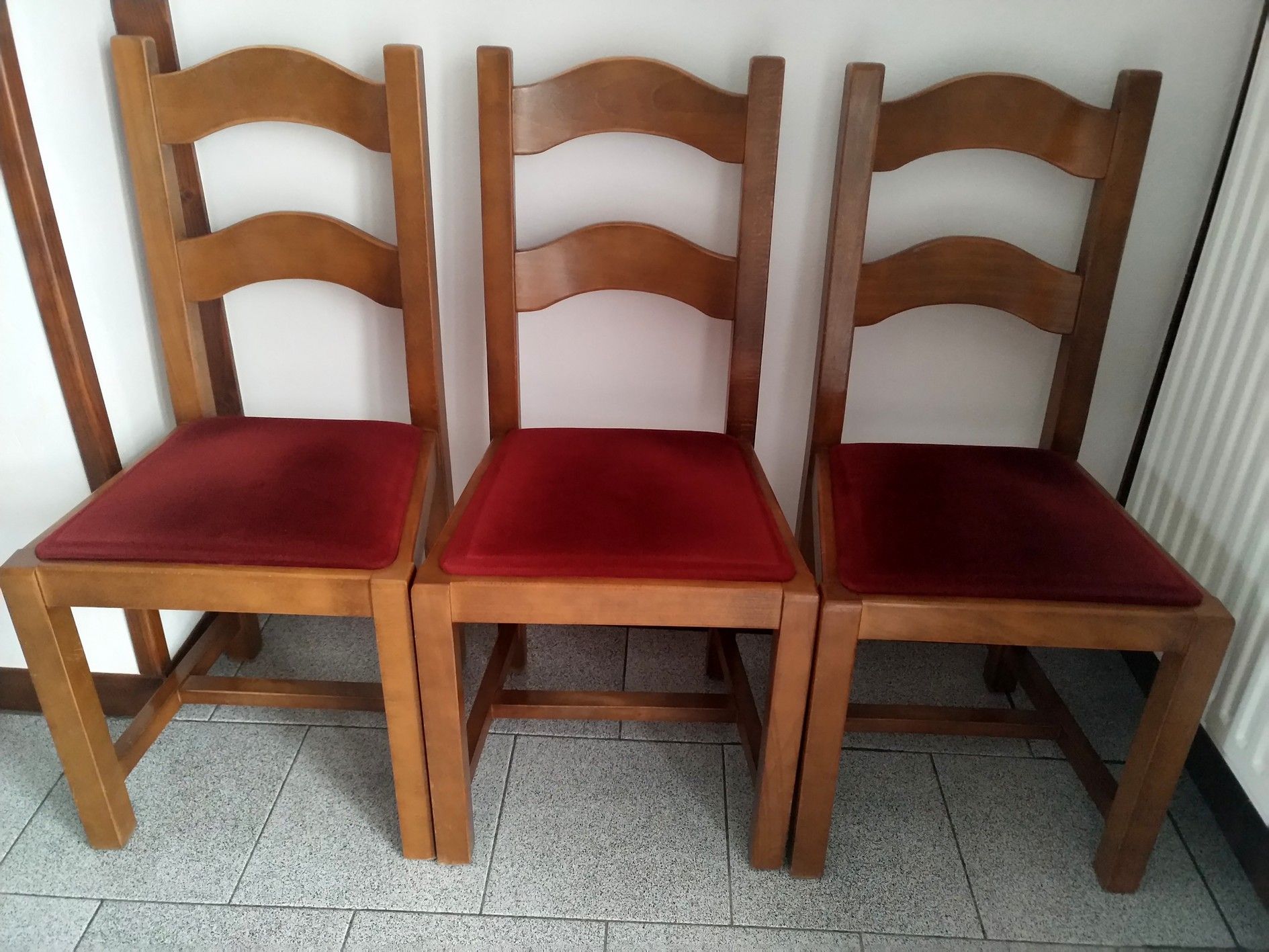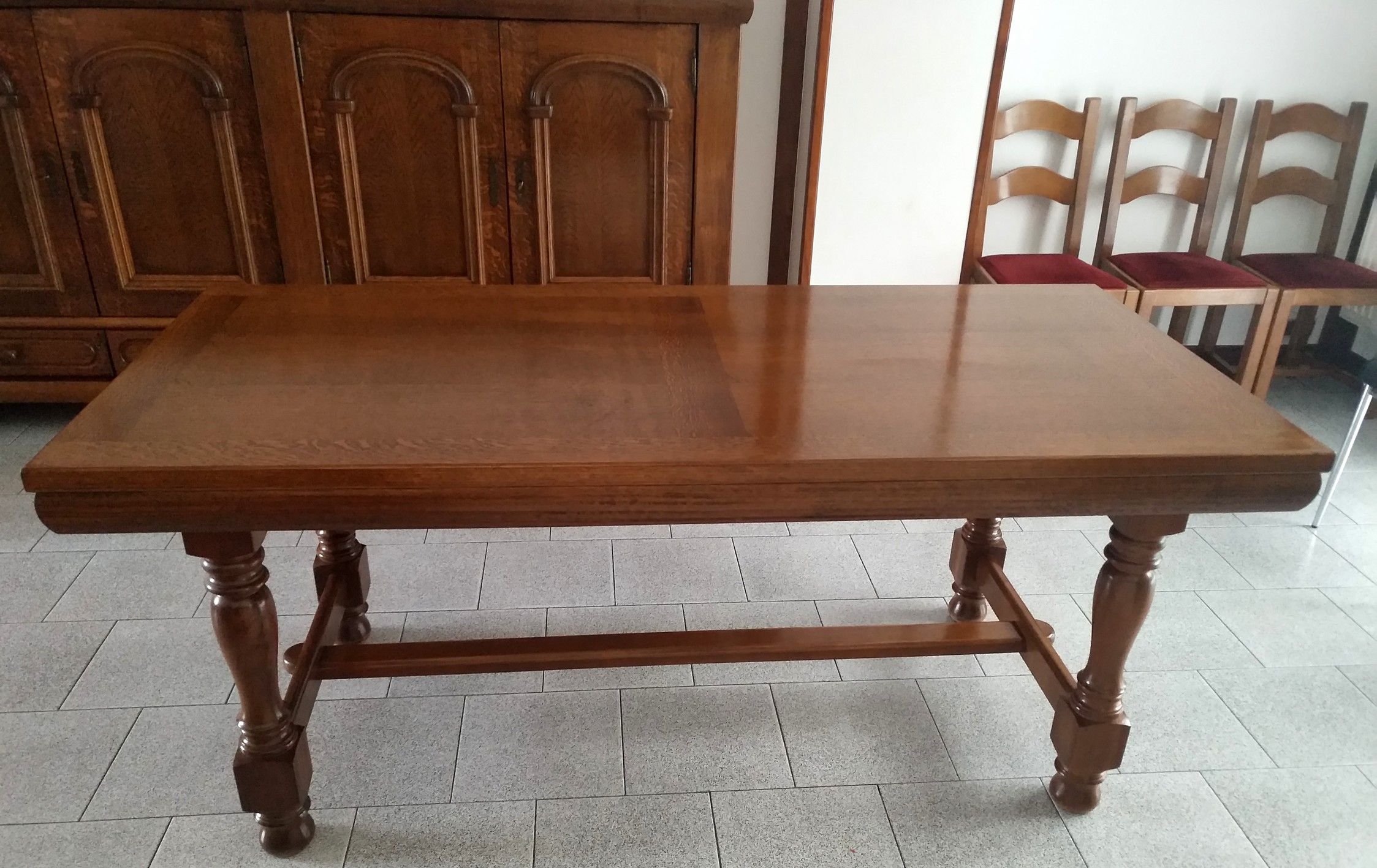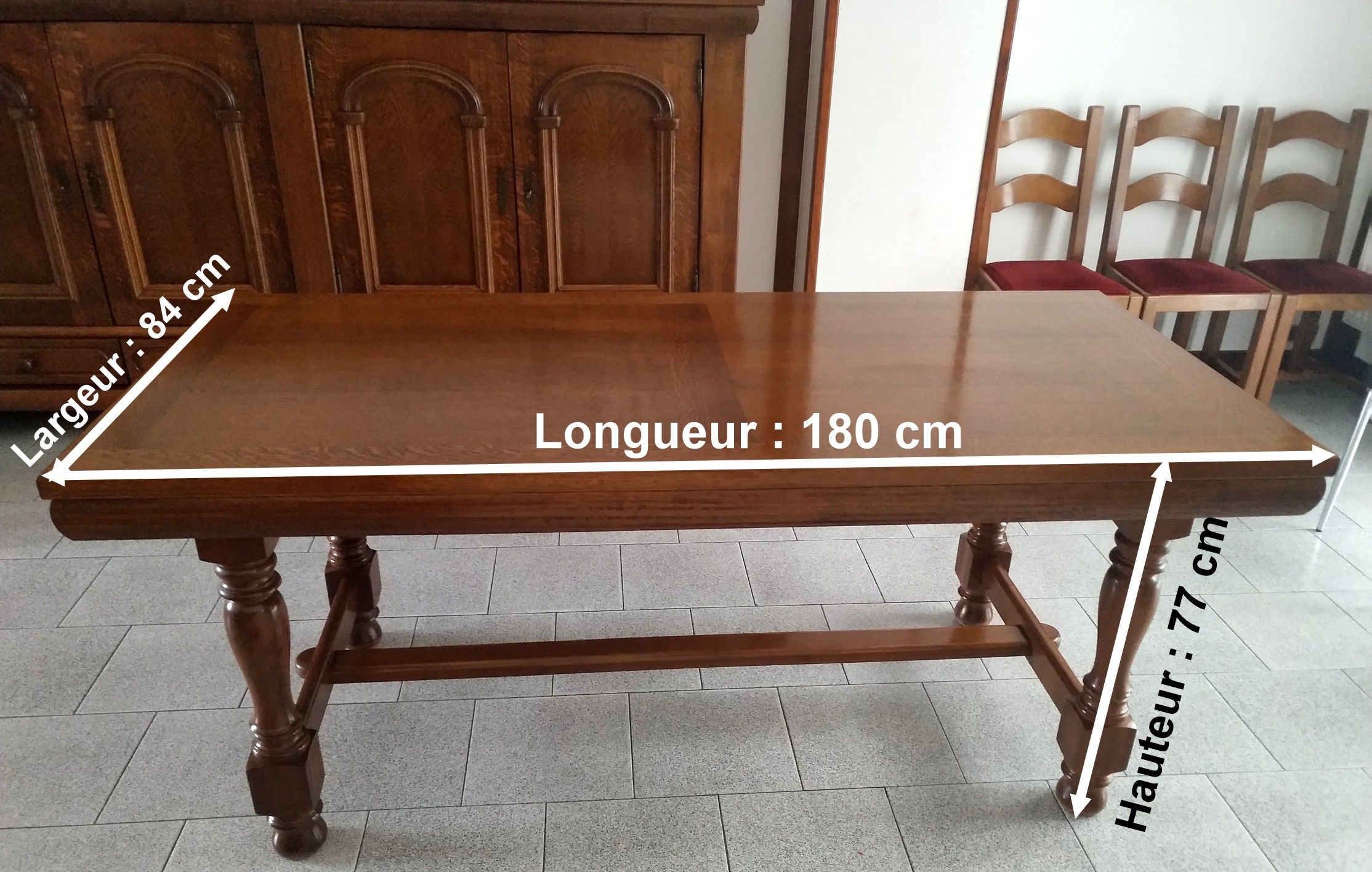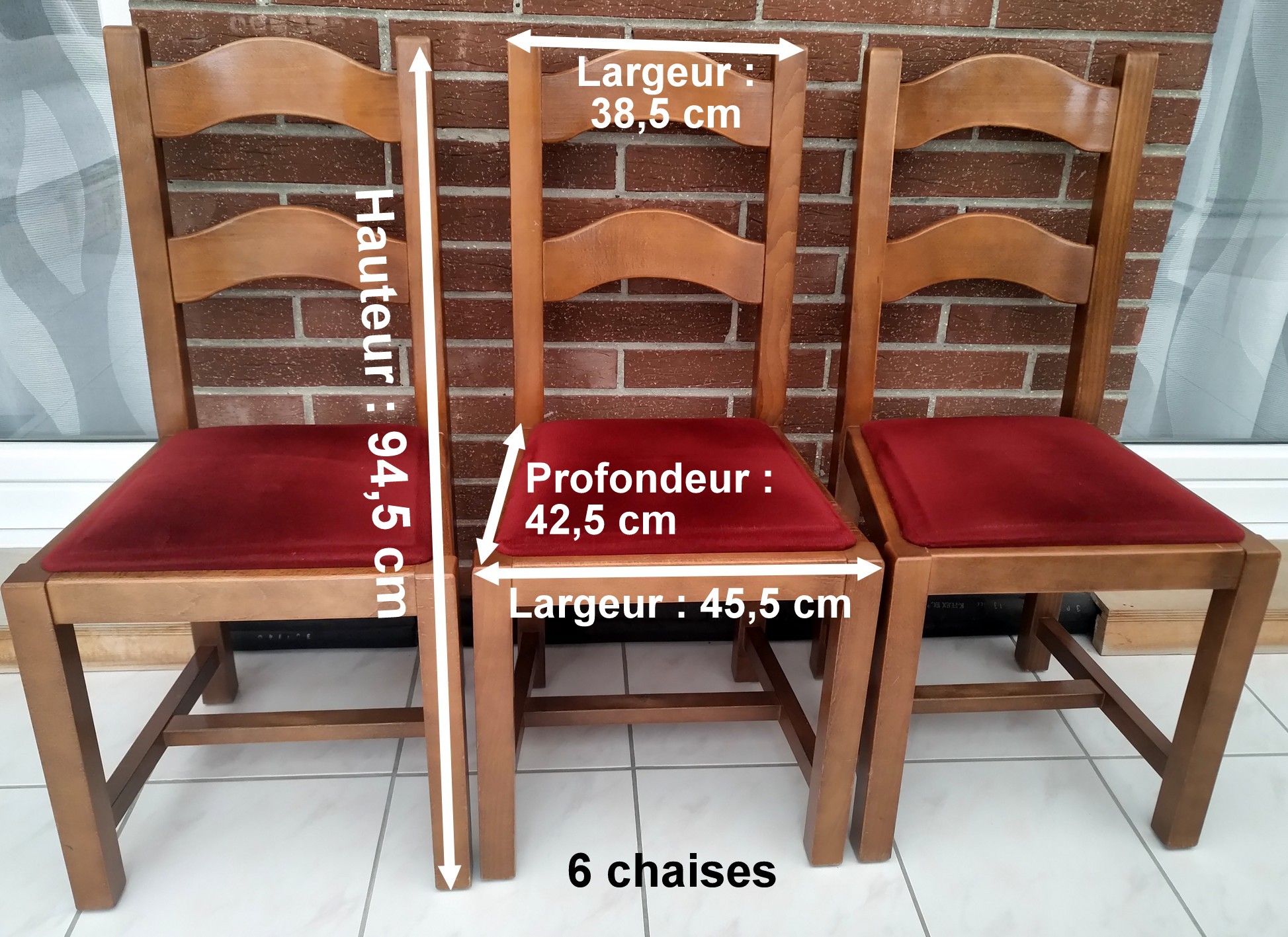 Une table en bois : hêtre, chêne 6 chaises avec dessus en mousse recouvert de velours rouge.